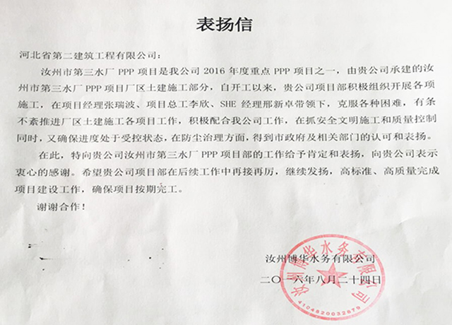 六分公司 河南汝州水厂项目受到甲方表扬 来源: 修改时间:2016.09.14 浏览:5446 六分公司河南汝州水厂项目受到甲方表扬 近日,业主将一封表扬信送到六分公司汝州第三水厂PPP项目部,该项目全体职工倍受鼓舞。该工程位于河南省汝州市,水厂厂区建设规模6万吨/d,工期240日历天。项目人员经过两个半月的努力,已完成工程总任务量的42%,该工程最大清水池于近期封顶,吸水井已完工,泵房达到±0,其他房号底板已完成。(曹艳玲) 上一条 返回列表 下一条