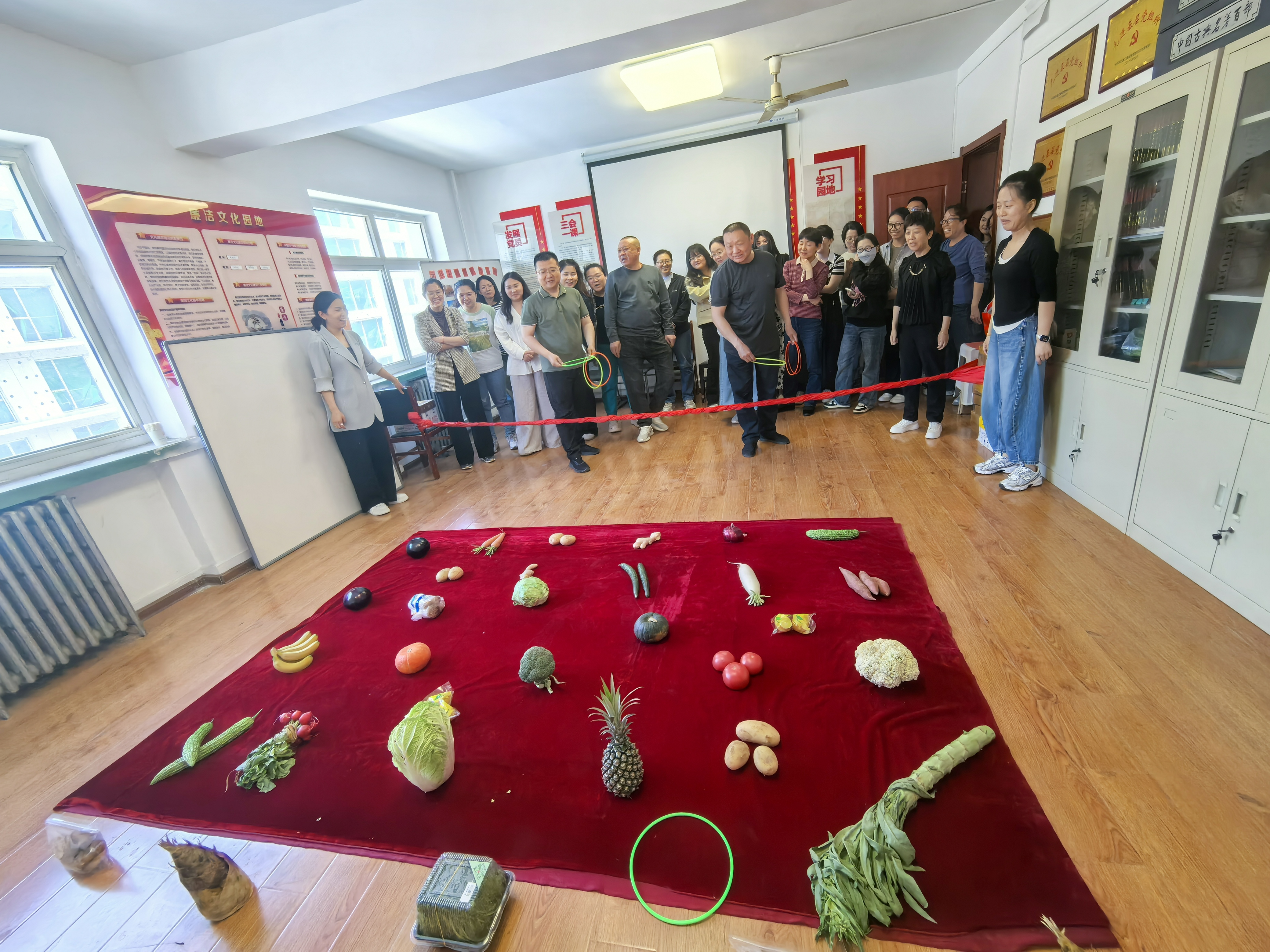 除推出“减脂餐”外,分公司还组织了果蔬套圈活动。活动规则简单:职工站在指定位置,每人四次机会,完整套中就能把蔬菜拿回家!活动现场,工作人员一早就打扫好了场地,精心布置了各种新鲜蔬菜水果,如西蓝花、莴笋、西红柿、茄子、南瓜等。在工作人员的引导下,大家兴致勃勃,跃跃欲试,紧张有序地开始套圈活动。